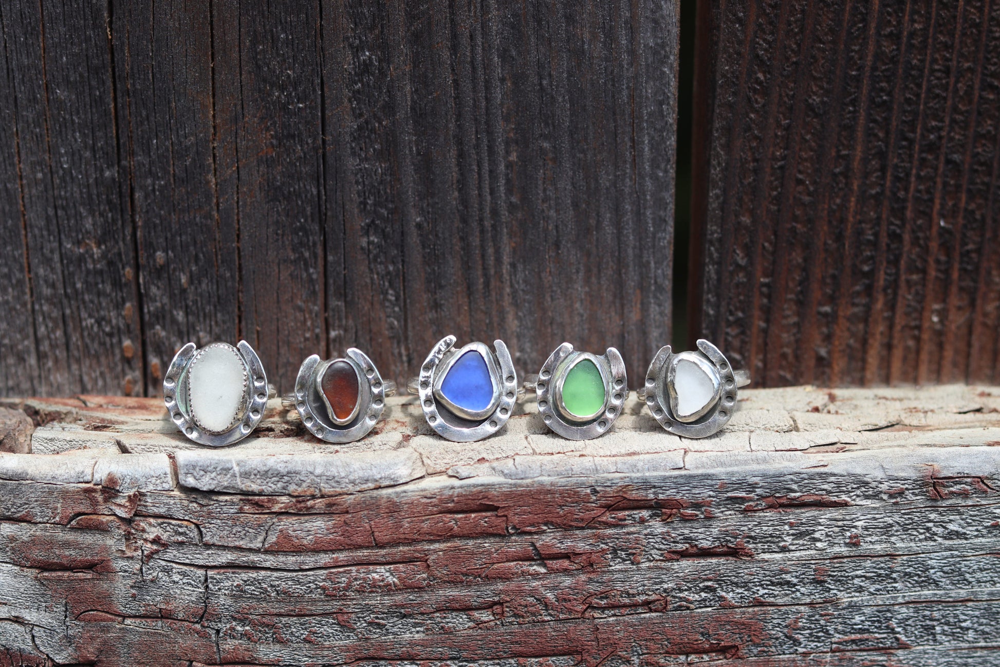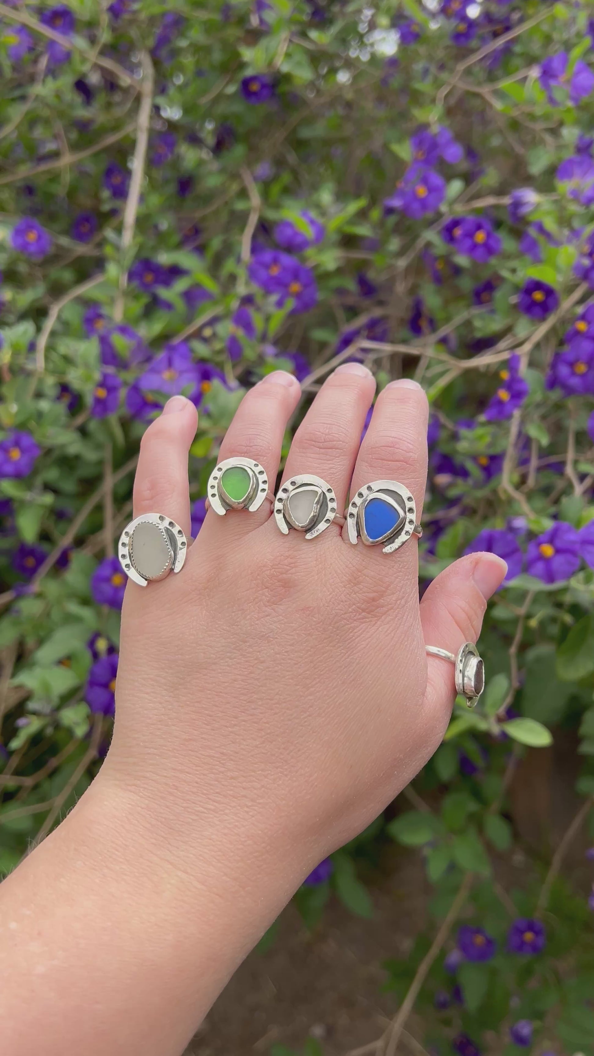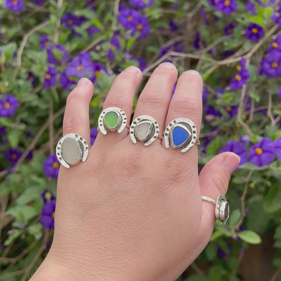 Made out of .925 Sterling Silver and genuine sea glass. This Horseshoe ring captures the coastal western vibe, perfect for summer time! Size 8.5 Ring.