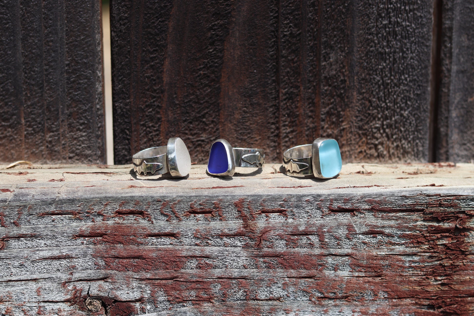 This Chunky Sea Glass ring is made out of .925 Sterling Silver and genuine sea glass. With a thicker band accented with trout cutouts makes the perfect ring for a simpler look. Size 8 Ring.