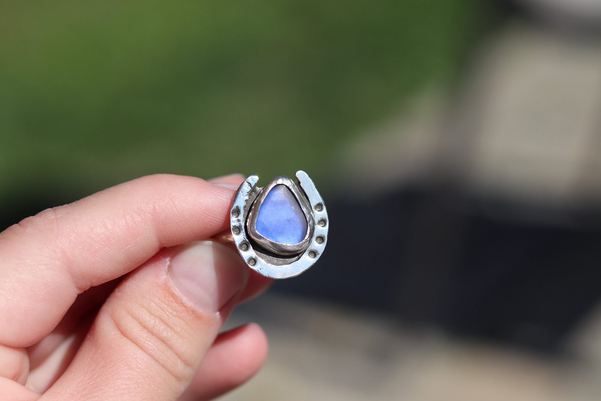 Made out of .925 Sterling Silver and genuine sea glass. This Horseshoe ring captures the coastal western vibe, perfect for summer time! Size 9 Ring.