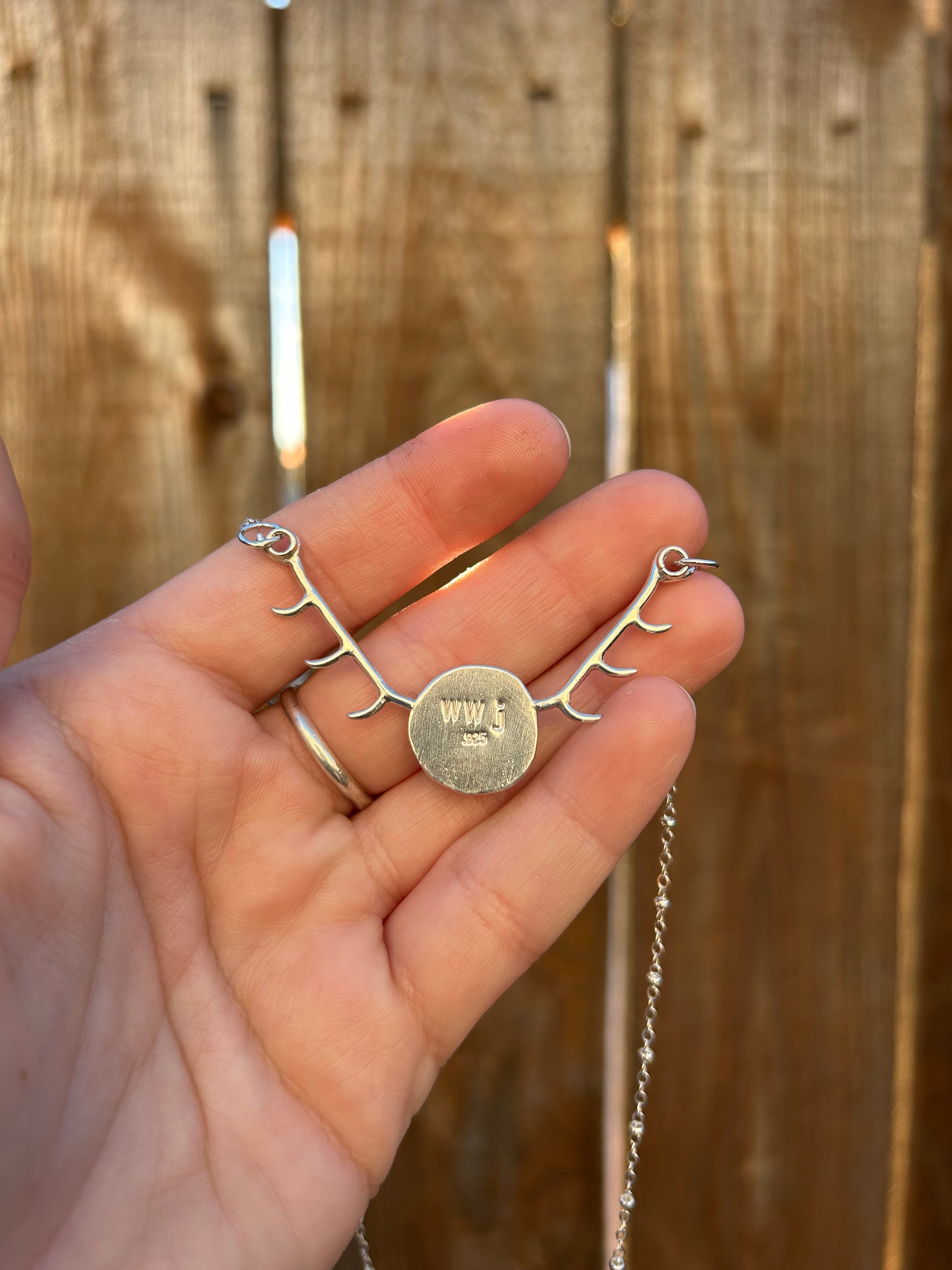 This antler necklace is handmade out of .925 sterling silver and has a genuine fossilized coral stone in it. It is the perfect necklace for a wilderness lover and is lightweight for comfortable everyday wear. It comes with a 16” chain.