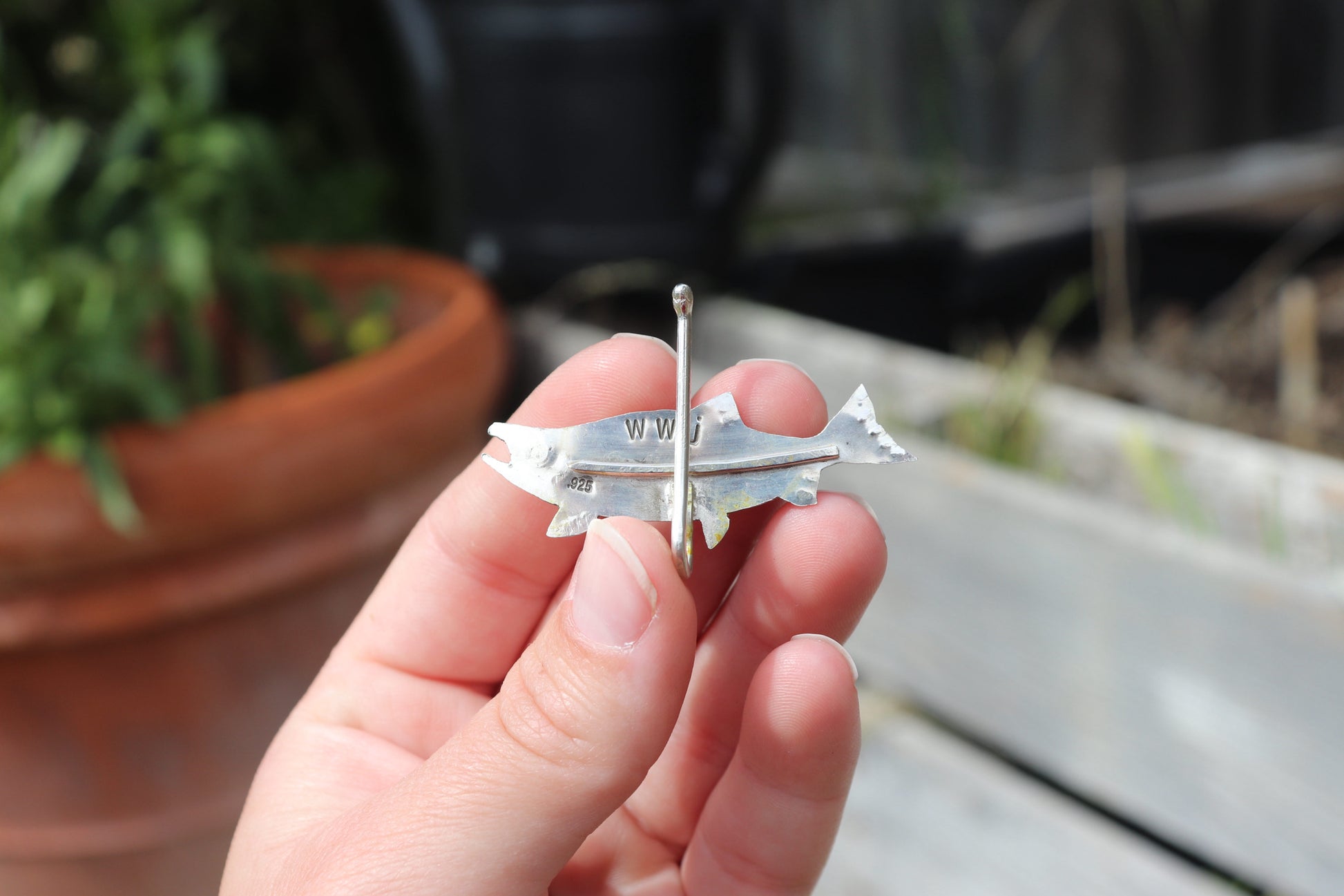 Made out .925 Sterling Silver. This Brim Fin is made to be worn on the brim of a Baseball Cap (Duckbill Hat).