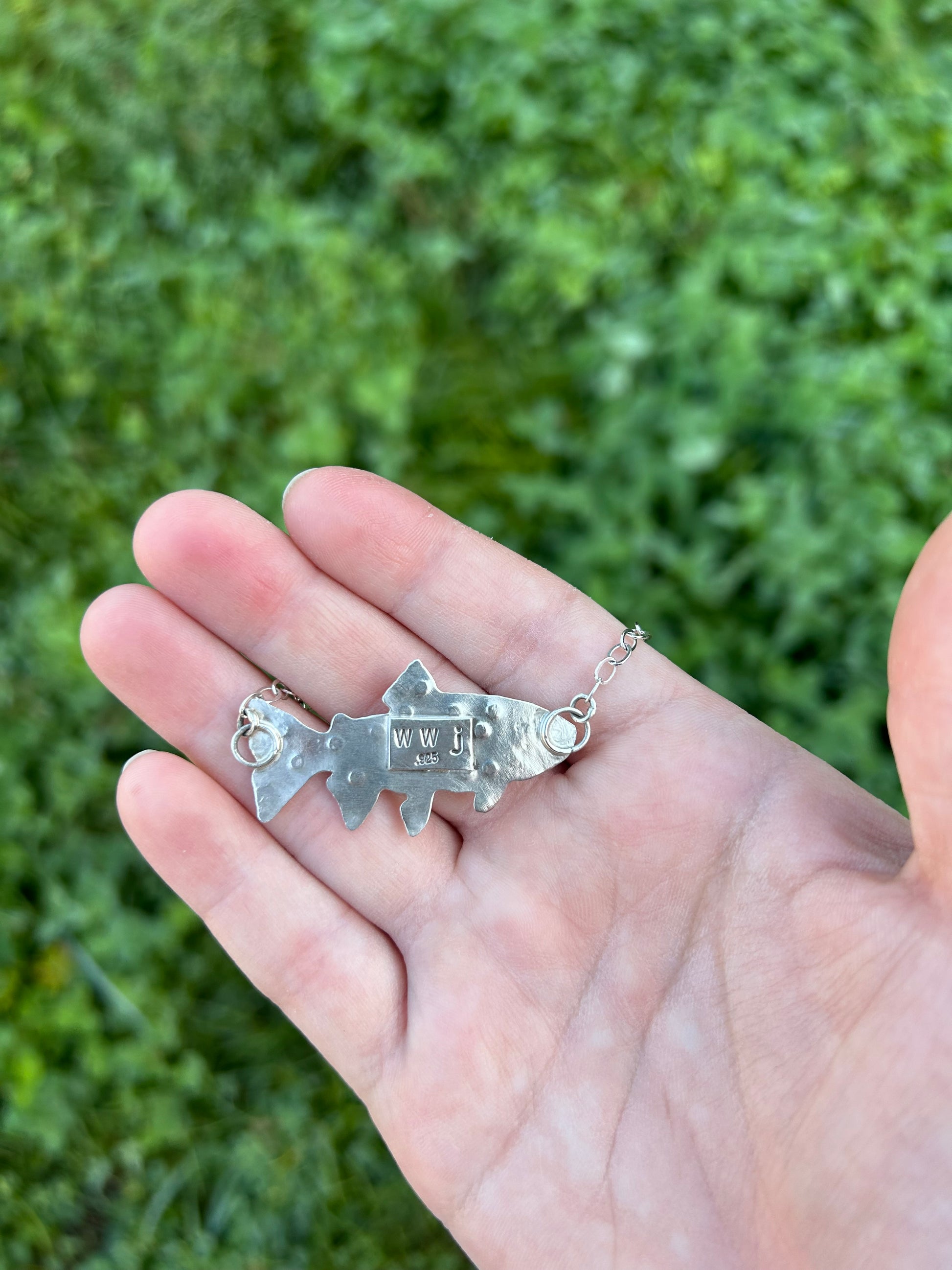 This Spooky Necklace is made out of .925 Sterling Silver and a genuine white jasper stone. It comes with a 16” chain that is not resizable.