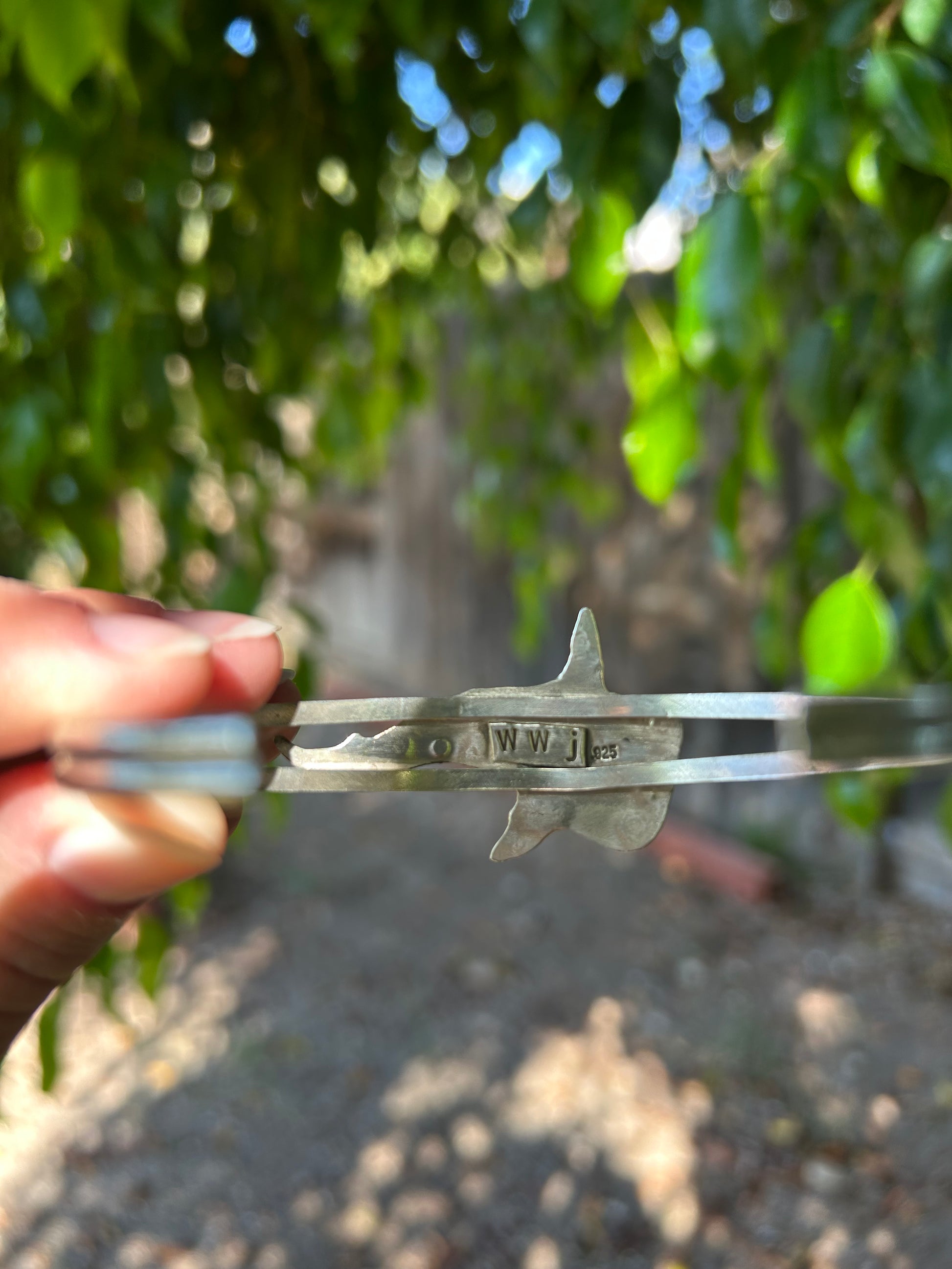 Handmade out of .925 Sterling Silver and has a geniune piece of Labradorite set in it. Definitely a lightweight piece of jewelry that you barely notice when it is on. It is a size 7 with a 1 inch gap.