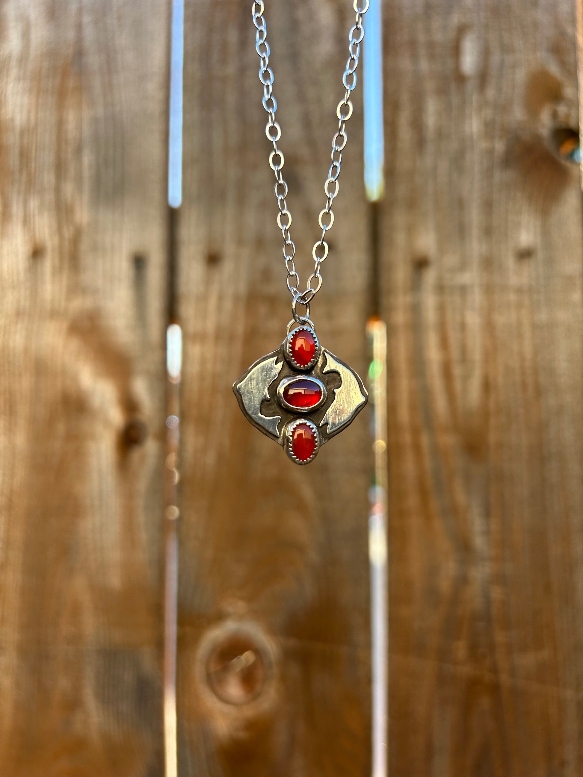 This Trout Necklace is handmade out of .925 sterling silver and has a genuine hessonite and carnelian stone in it. It is the perfect necklace for a wilderness lover and is lightweight for comfortable everyday wear. It comes with a 16” chain.