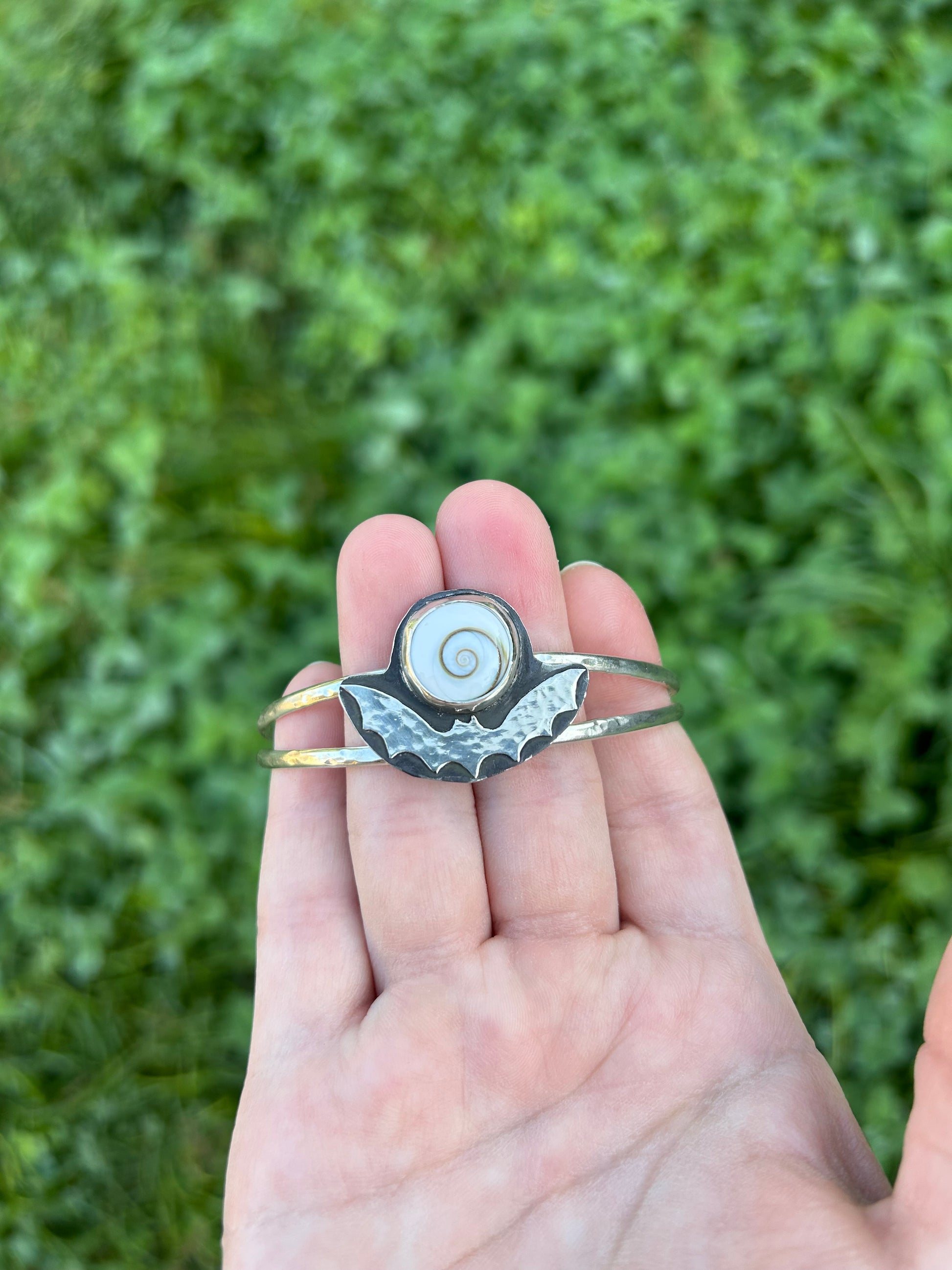 This Spooky Bat Cuff is made out of .925 sterling silver and a genuine operculum shell. It is a size 6 cuff with a 1” gap.