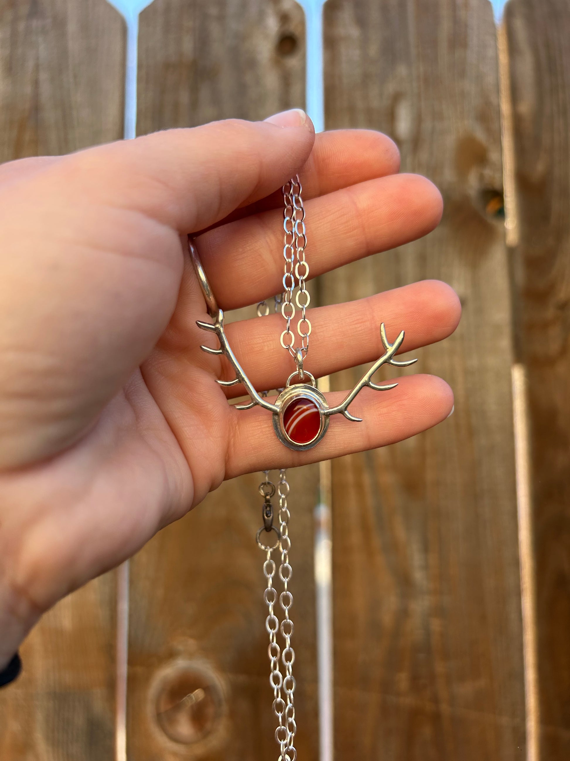 This antler necklace is handmade out of .925 sterling silver and has a genuine red banded agate in it. It is the perfect necklace for a wilderness lover and is lightweight for comfortable everyday wear.