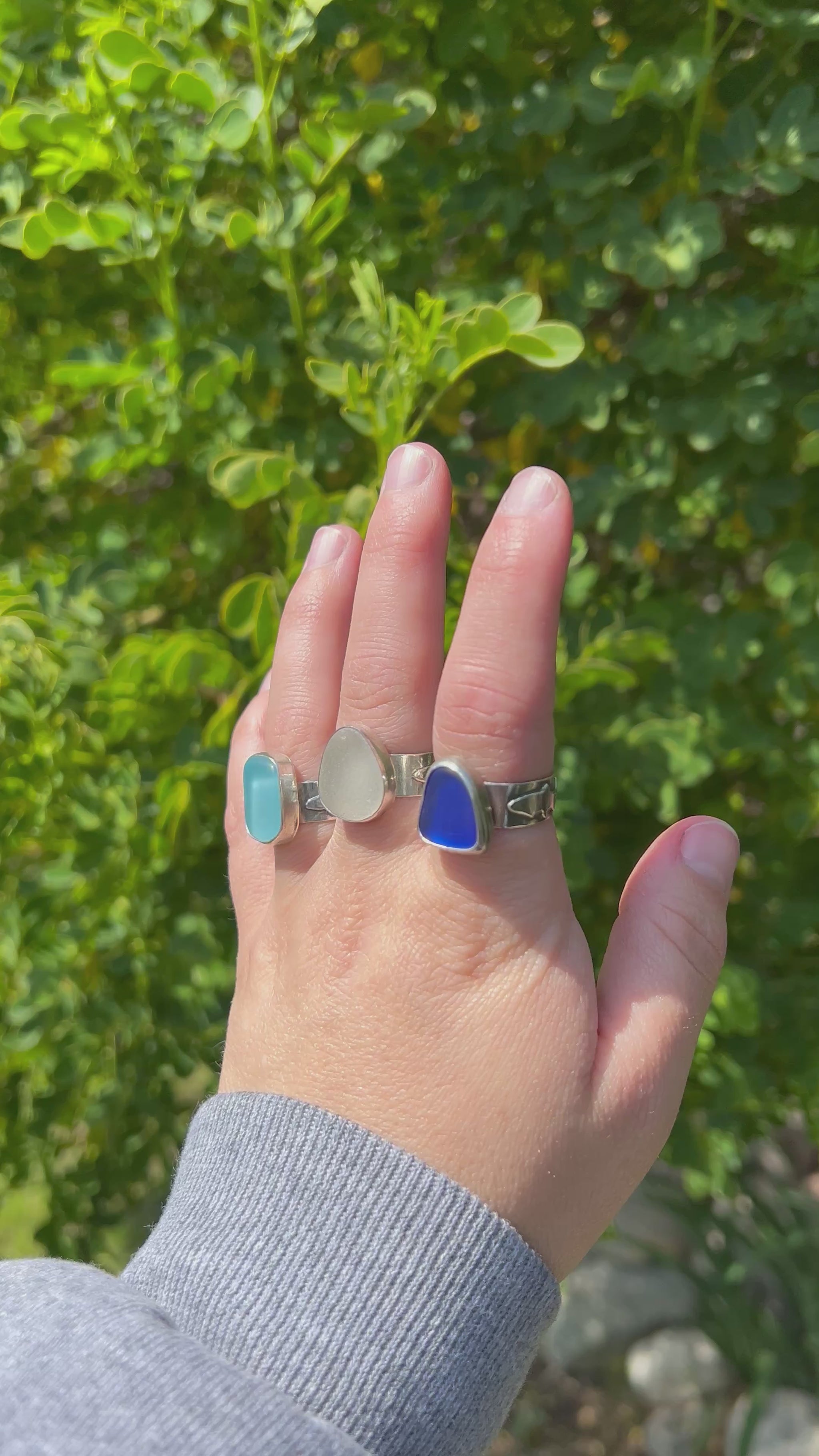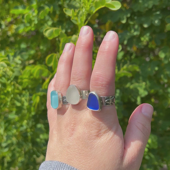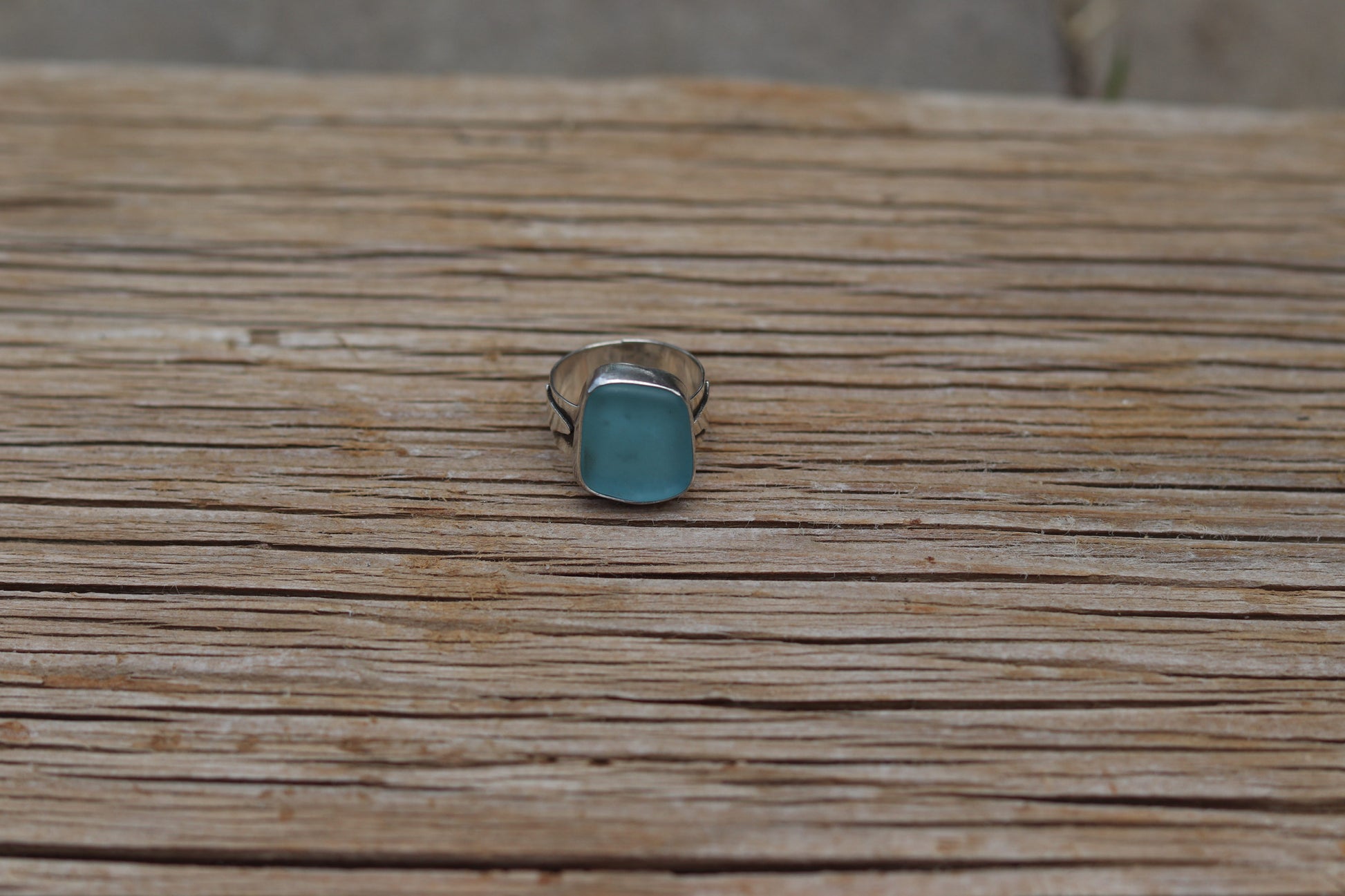 This Chunky Sea Glass ring is made out of .925 Sterling Silver and genuine sea glass. With a thicker band accented with trout cutouts makes the perfect ring for a simpler look. Size 6.5 Ring.
